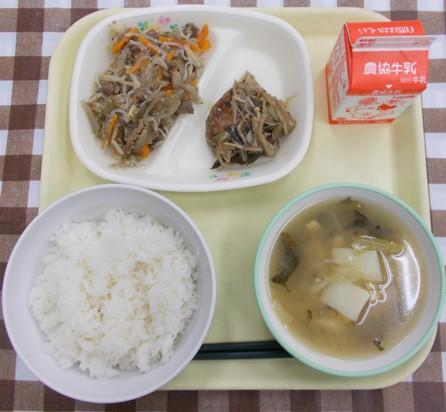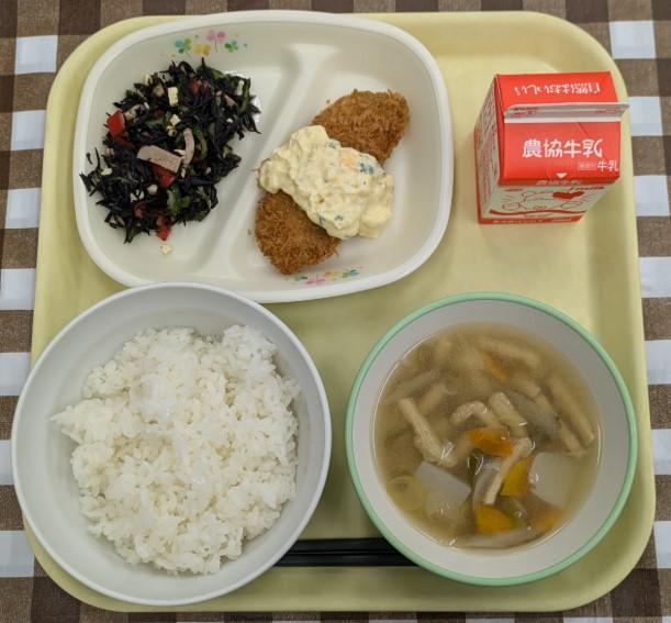 白ごはん、ホキのフライ、ひじきのマリネ、田舎汁、牛乳