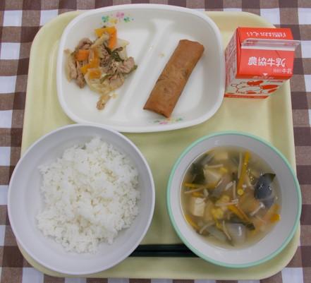 白ごはん、春巻き、ホイコーロー、中華コーンスープ、牛乳