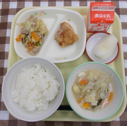 白ごはん、鶏肉の照り焼き、野菜炒め、みそけんちん汁、なし、牛乳
