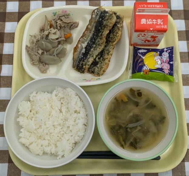 白ごはん、さんまの唐揚げ、豚肉のごぼうのしぐれ煮、みそ汁、