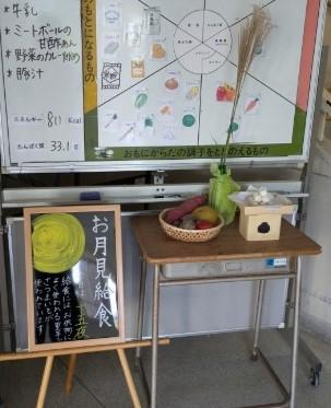 献立ホワイトボードの前にはお月見のお供え物をイメージした掲示を