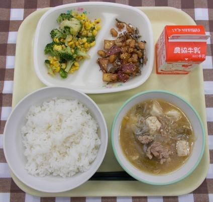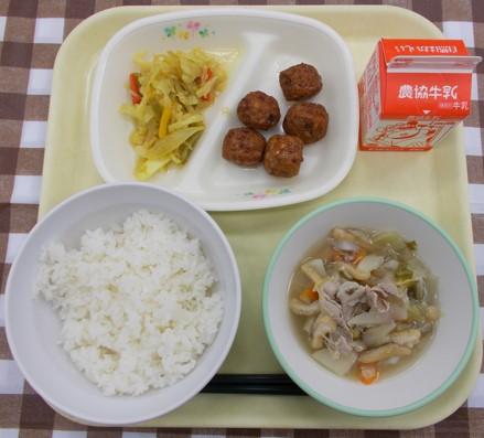 白ごはん、ミートボールの甘酢あん、野菜のカレー炒め、豚汁、牛乳