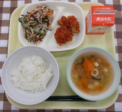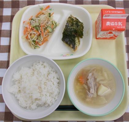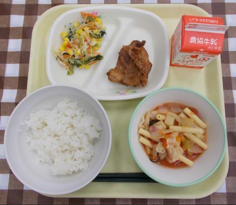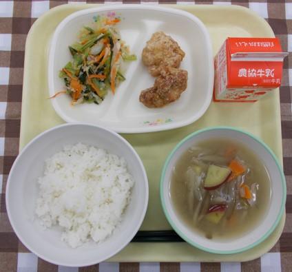 白ごはん、鶏肉の竜田揚げ、キャベツの甘酢和え、さつま汁、牛乳