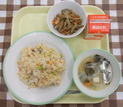 鮭チャーハン、きんぴらごぼう、豆腐のみそ汁、牛乳