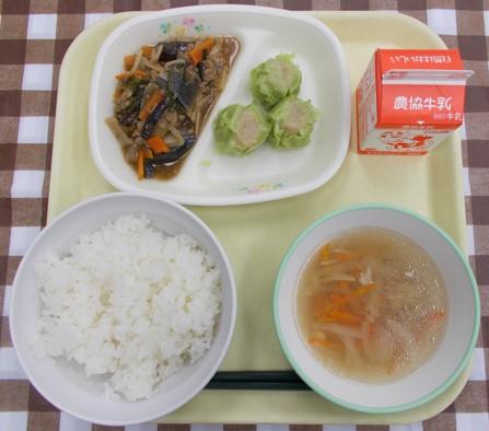 白ごはん、枝豆シューマイ、マーボーナス、中華スープ、牛乳