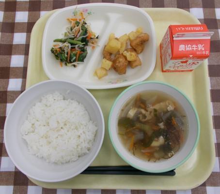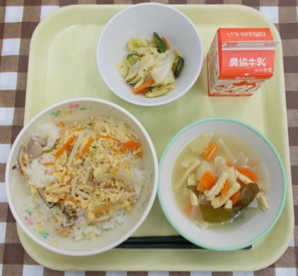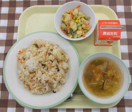 シーチキンごはん、じゃがいものごまあえ、中華スープ、牛乳