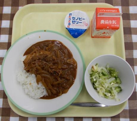 ハヤシライス、サラダ、セノビ―ゼリー、牛乳