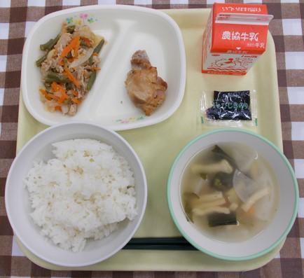 白ごはん、鶏肉の照り焼き、いんげんの肉炒め、みそ汁、ひじきのり、牛乳