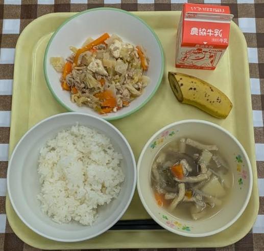 白ごはん、厚揚げと豚肉の炒め煮、田舎汁、バナナ、牛乳