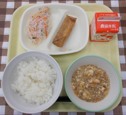 白ごはん、春巻き揚げ、バンサンスー、麻婆豆腐、牛乳