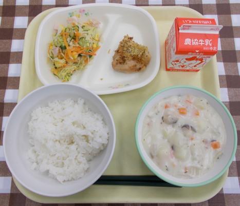 白ごはん、鶏肉の香味焼き、サラダ、クラムチャウダー、牛乳