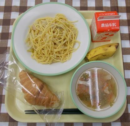 クロワッサン、春キャベツのパスタ、レタススープ、バナナ、牛乳