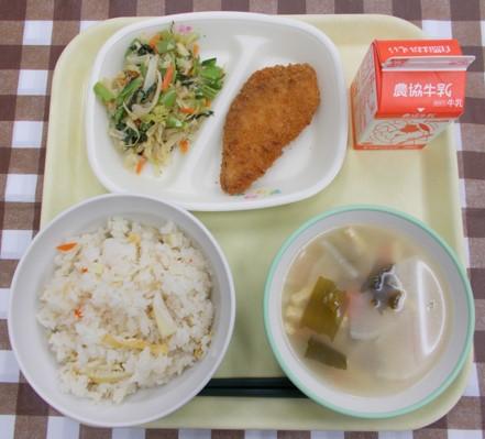 たけのこごはん、サーモンチーズフライ、ごまあえ、