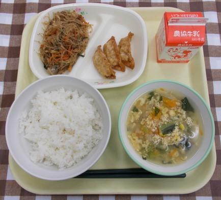 白ごはん、ぎょうざ、麻婆春雨、かきたまコーンスープ、牛乳