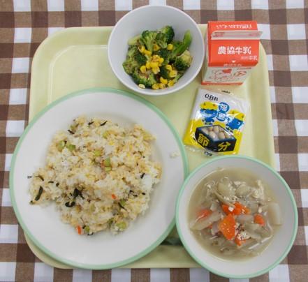 鮭ちらし、おかかあえ、けんちん汁、節分豆、牛乳