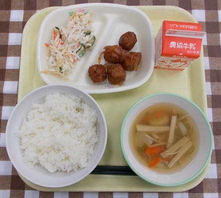 白ごはん、ミートボールのケチャップ煮、イカくんサラダ、