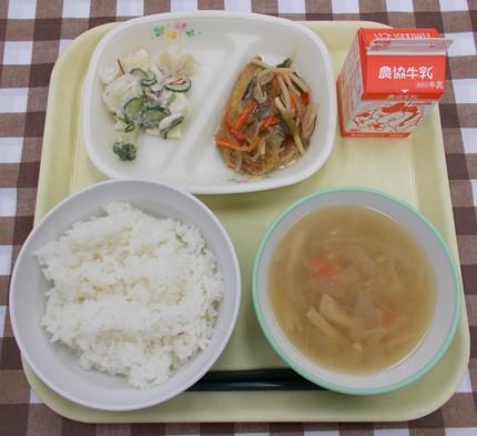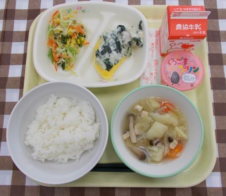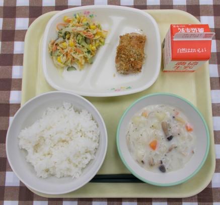 白ごはん、魚の野菜あんかけ、ポテトサラダ、みそ汁、牛乳