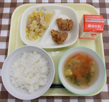 白ごはん、鶏肉の竜田揚げ、ジャーマンポテト、