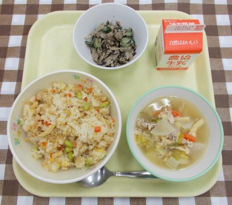 今日は鮭ちらしが、食缶のフタにくっつくほどたっぷりと