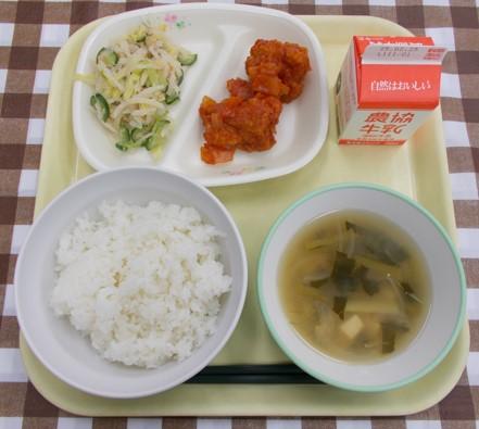 白ごはん、鶏肉のチリソース、大根サラダ、みそ汁、牛乳