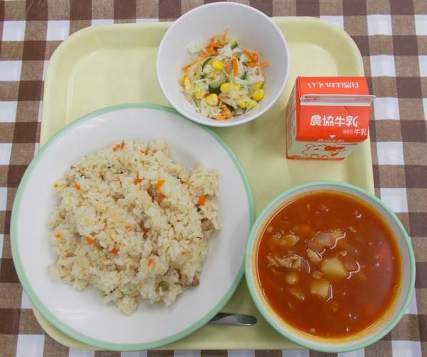 ピラフ、ポークビーンズ、コーンサラダ、牛乳