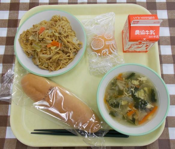 コッペパン、焼きそば、かきたまスープ、フローズン黄桃、牛乳