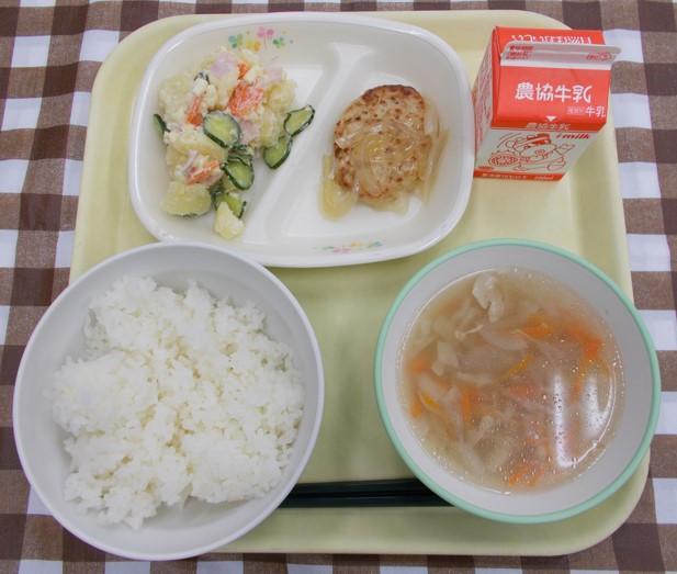 白ごはん、豆腐ハンバーグ、ポテトサラダ、オニオンスープ、牛乳