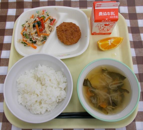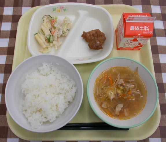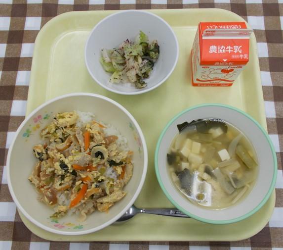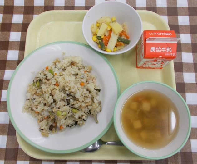 シーチキンご飯、じゃがいものごまあえ、中華スープ、牛乳