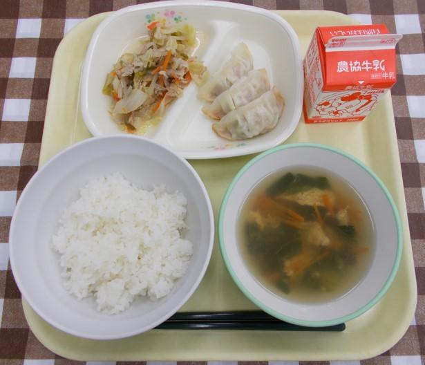 白ごはん、焼きぎょうざ、野菜炒め、チンゲン菜のスープ、牛乳
