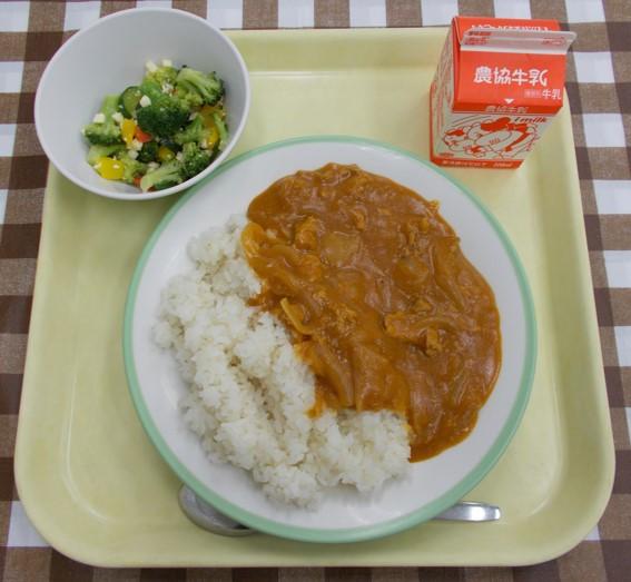 バターポークカレー、ブロッコリーのカラフルサラダ、牛乳