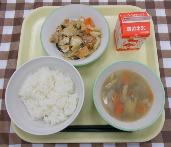 白ごはん、厚揚げと豚肉のみそ炒め、田舎汁、牛乳