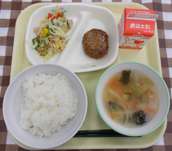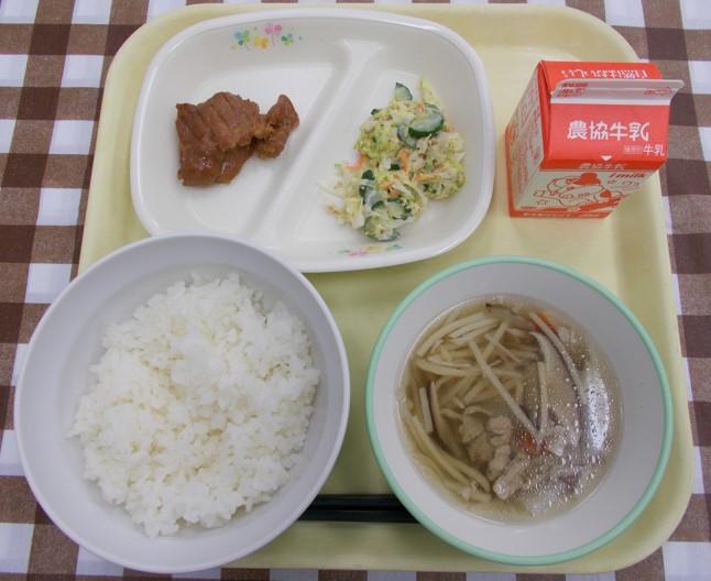 白ごはん、鶏肉の照り焼き、サラダ、沢煮椀、牛乳