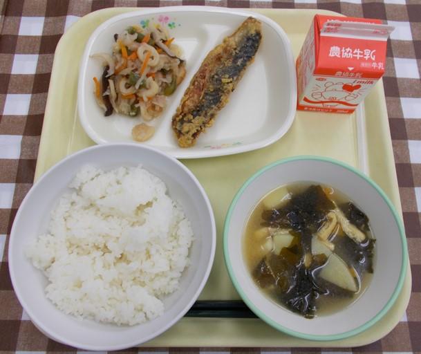 白ごはん、魚のカレー揚げ、切干大根の炒り煮、みそ汁、牛乳