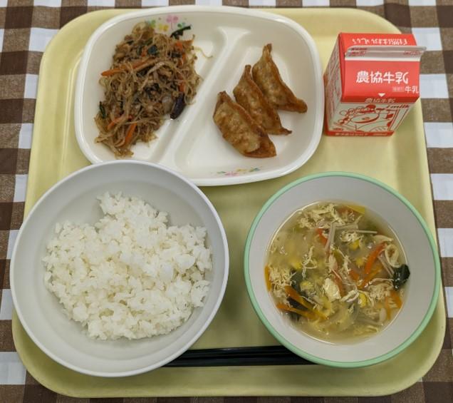 白ごはん、ぎょうざ、麻婆春雨、コーンかきたまスープ、牛乳