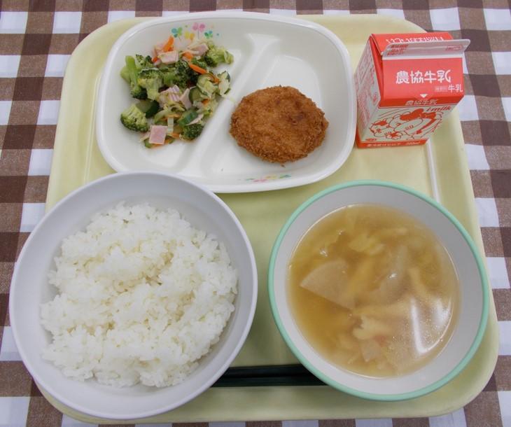 白ごはん、チキンカツ、ブロッコリーサラダ、みそ汁、牛乳