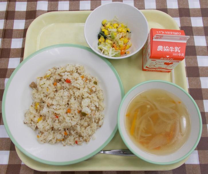 ガパオライス、コーンサラダ、コンソメスープ、牛乳