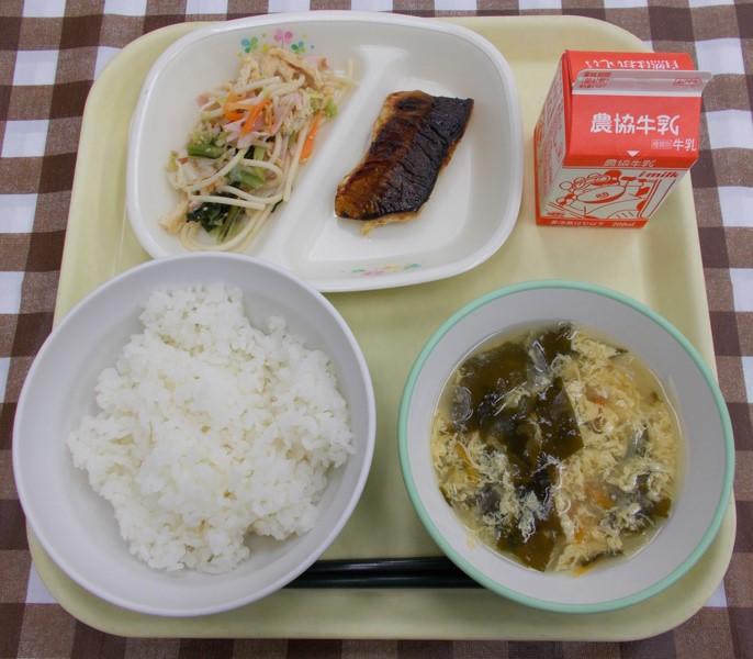 白ごはん、さわらの西京焼き、ちぐさあえ、かきたま汁、牛乳