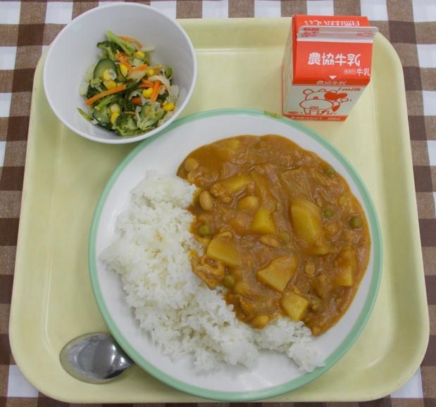 ビーンズカレー、サラダ、牛乳
