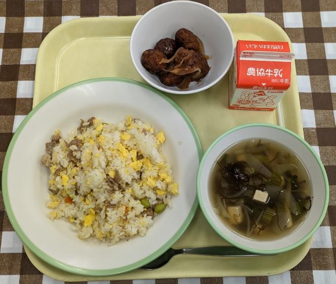 チャーハン、ミートボール、中華スープ、牛乳