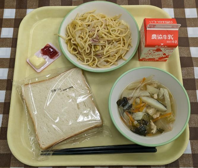 食パン、春野菜のスパゲティ、コンソメスープ、