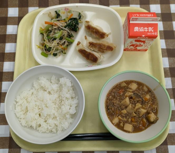 ごはん、ぎょうざ、もやしのおひたし、麻婆豆腐、牛乳