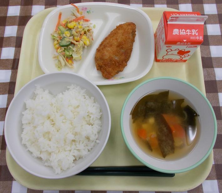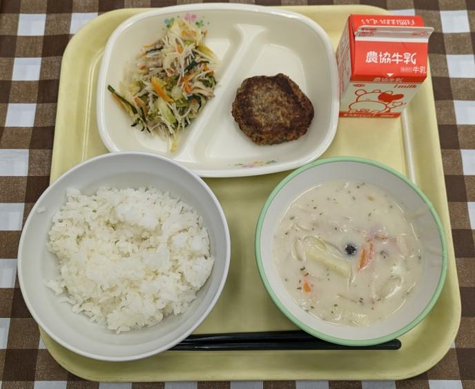 ごはん、いわしのハンバーグ、焼きビーフン、クリームスープ、牛乳