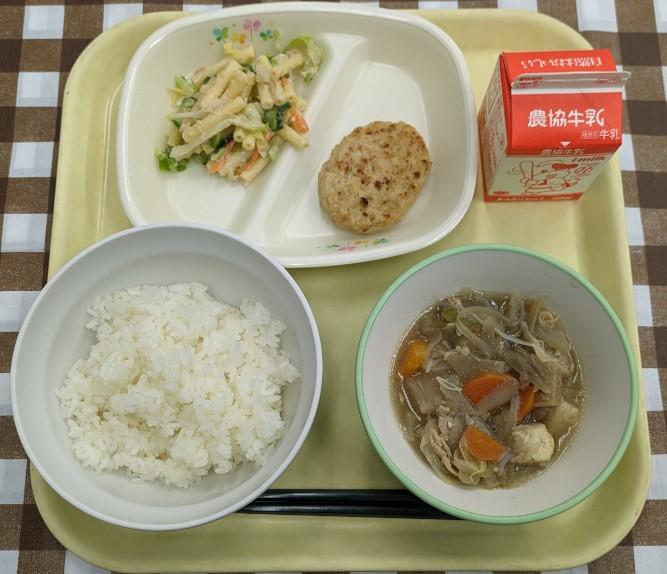 ごはん、豆腐ハンバーグ、マカロニサラダ、すき焼き風煮、牛乳