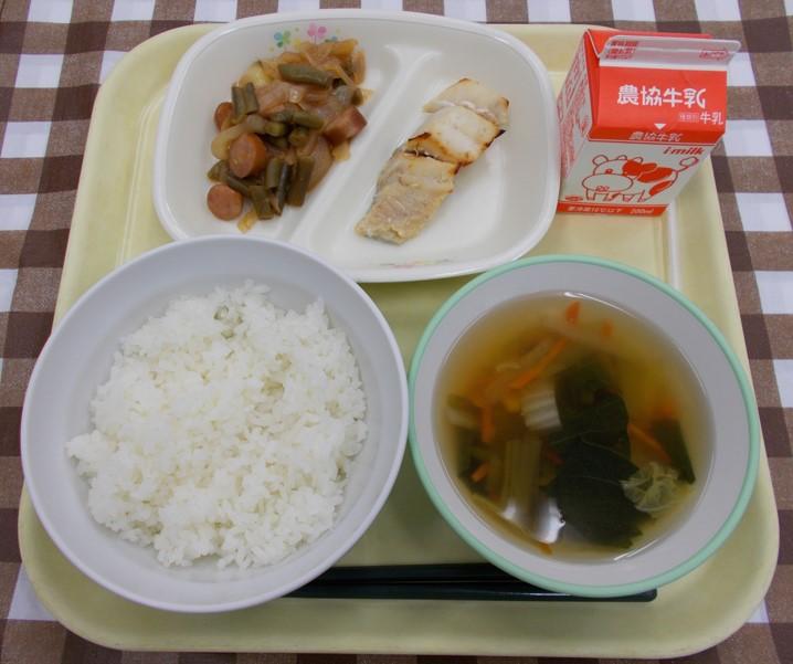 ごはん、ホキの西京焼き、ウインナーといんげん炒め、