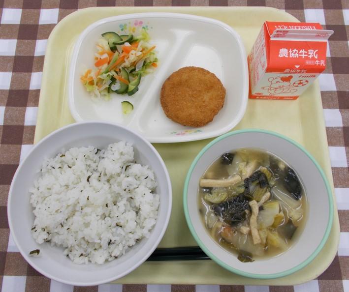 わかめごはん、メンチカツ、添え野菜、