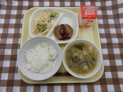 ごはん、ハンバーグ、マカロニサラダ、みそ汁、牛乳
