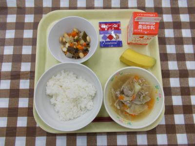 ごはん、ふりかけ、大豆の五目煮、豚汁、バナナ、牛乳