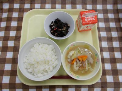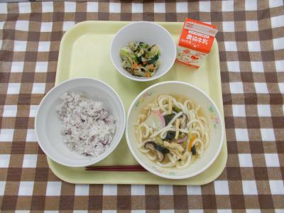ゆかりごはん、いそか和え、五目うどん、牛乳