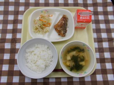 ごはん、さばの竜田揚げ、ごま酢和え、すまし汁、牛乳