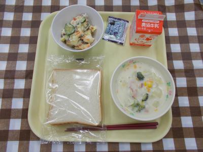 食パン、ブルーベリージャム、ハーフポテトサラダ、クリームチャウダー、牛乳